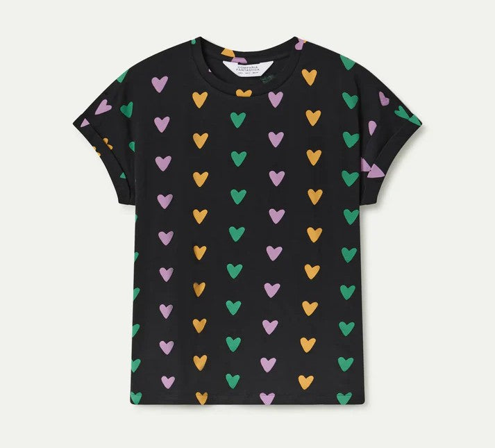 Bright happy colored hearts on a classic black tee. Cuffed capsleeves and crew neckline