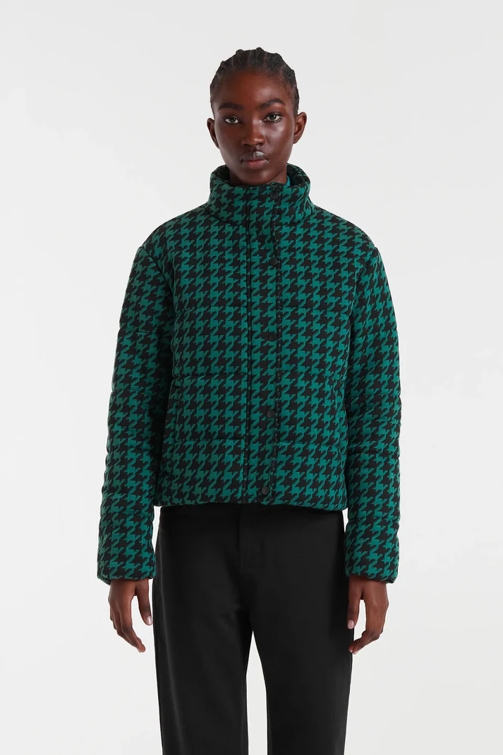 Quilted coat with a black and green houndstooth print. High neck and long sleeves with elastic cuffs. Front zip closure with snaps on placket. Slightly dropped shoulders. Lined.