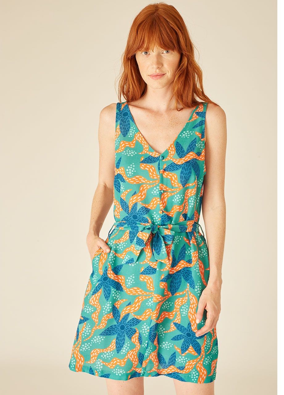 A print of underwater botanicals for all the ocean lovers. Turquoise background with multi-colored prints. V-neckline in front and back. Button up with sash tie.