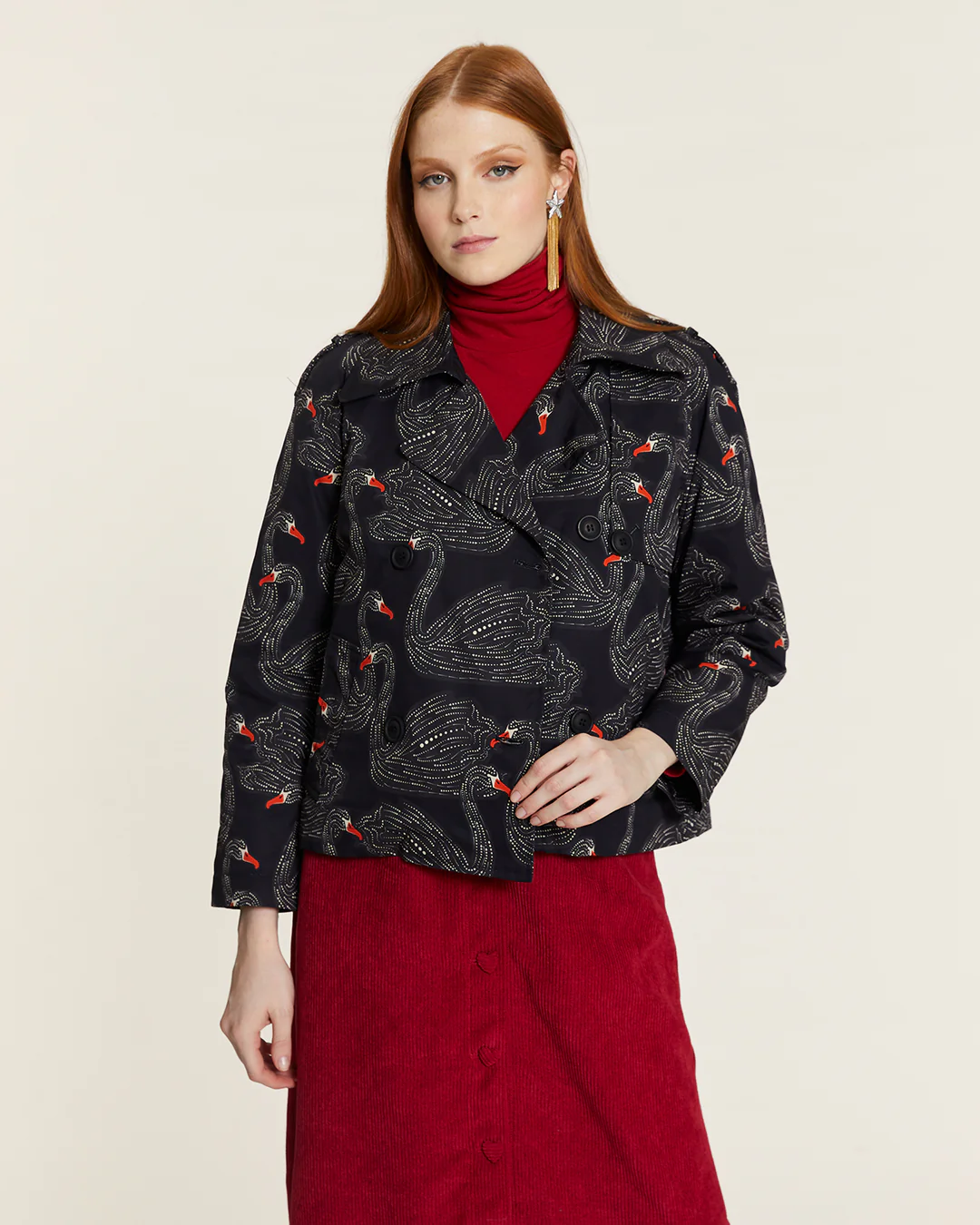 Stunning fall to winter jacket with inner quilting! Short jacket with swan print, quilted lining, four buttons, angel sleeves and rounded peak lapels.