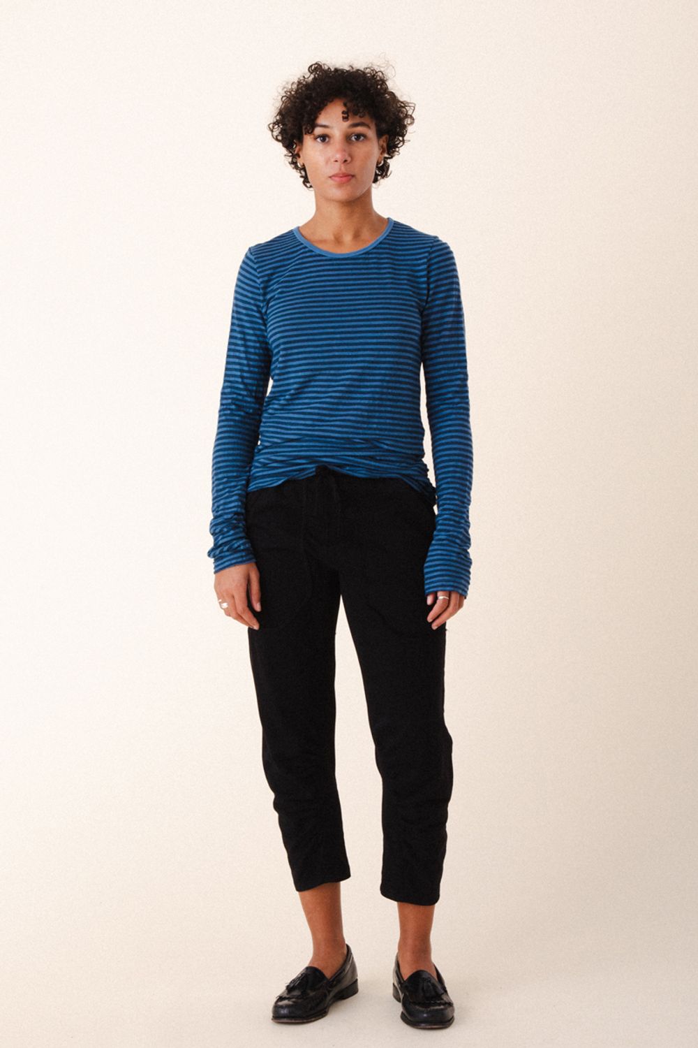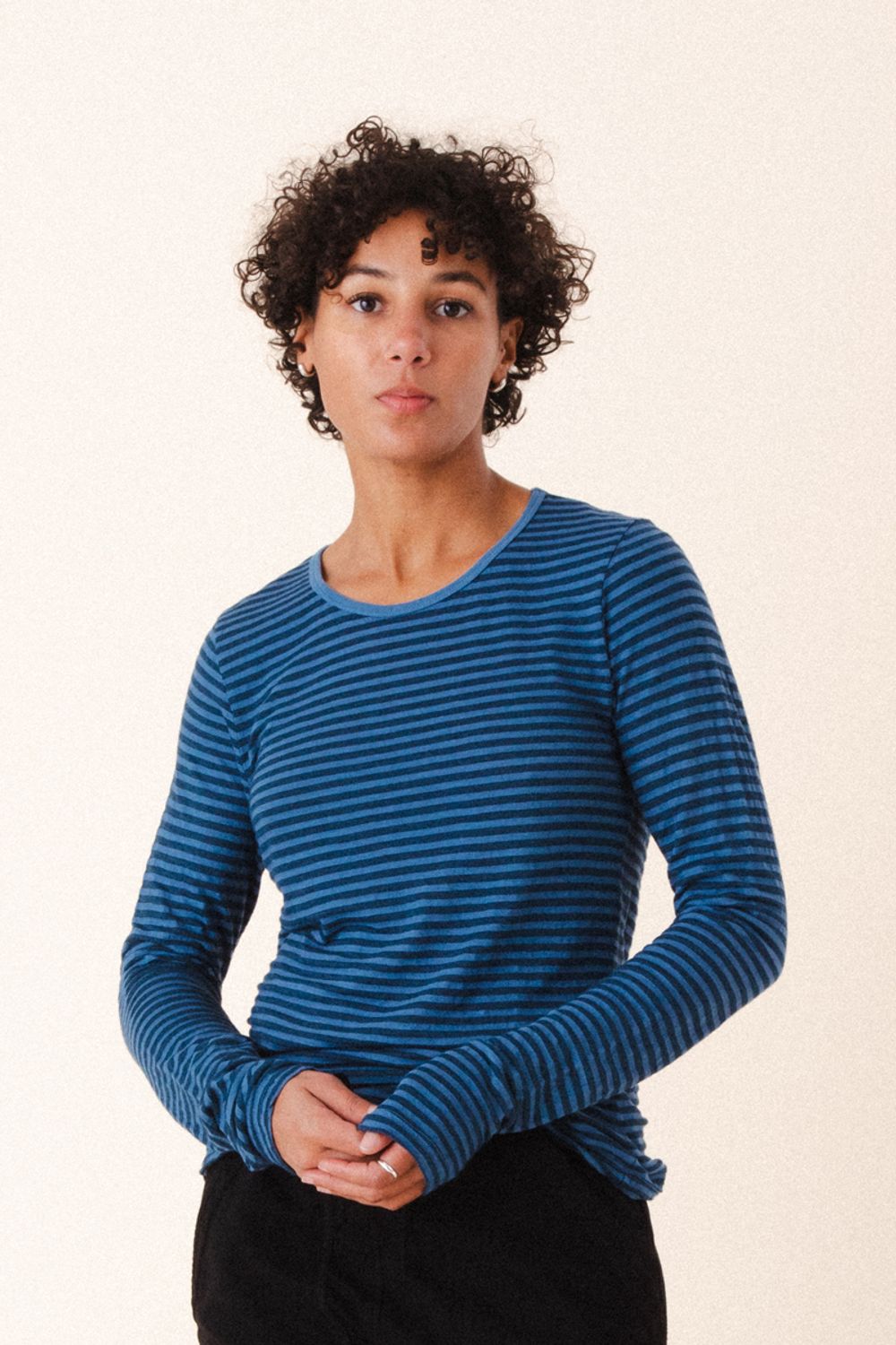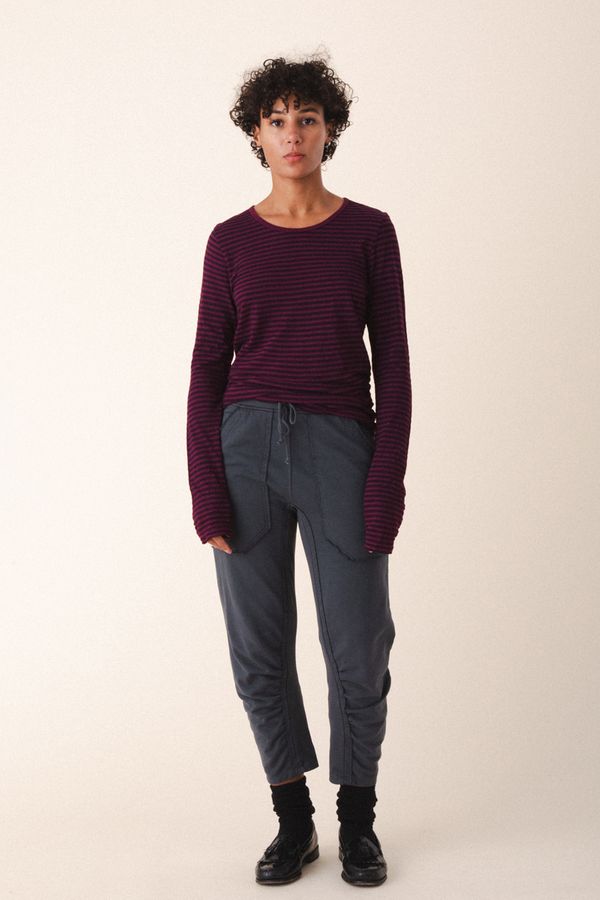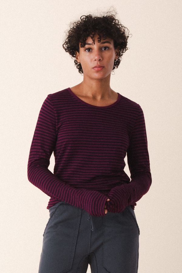 A soft knit, tonal striped basic that elevates any ensemble! Offered here in Beet and Storm. Great with denim, cargo pants or chinos.