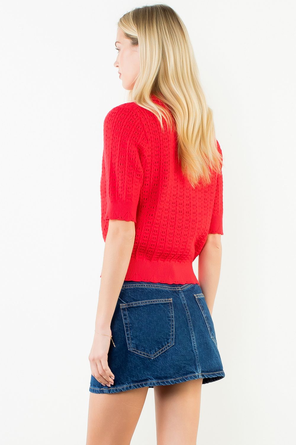Sweet red short-sleeved sweater with split neck and collar. Textured knit in bright red!